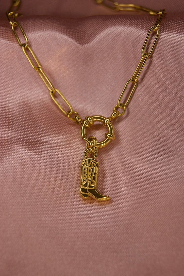 Geef jouw ketting een stoere, trendy twist met onze gouden cowboylaars bedel uit de Charm Bar. Deze charm is gemaakt van stainless steel en ontworpen om eindeloos te mixen & matchen. De cowboylaars is een echte fashion-statement bedel: een beetje western, een beetje edgy en toch super draagbaar — perfect om jouw sieraden net wat unieker te maken.