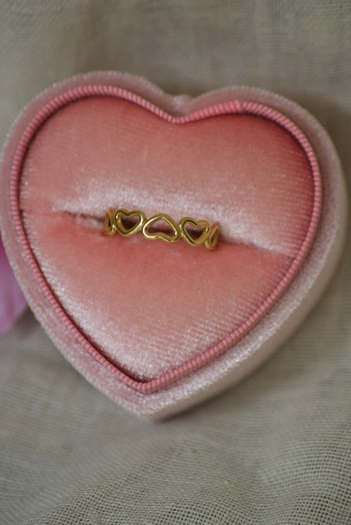 De Hartjesrij ring is een lieve, minimalistische ring met drie open hartjes naast elkaar. Subtiel genoeg voor elke dag, maar door het speelse hartjesdesign toch een echte eyecatcher. Perfect om solo te dragen voor een romantische touch, of te combineren met andere ringen voor een trendy ringstack. Verkrijgbaar in goud en zilver.